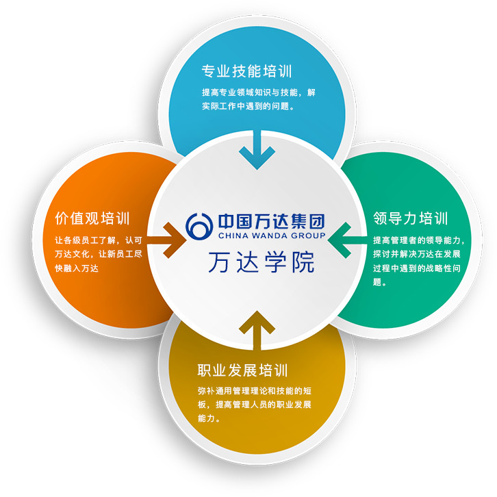 2013年7月,萬(wàn)達(dá)學(xué)院正式成立,標(biāo)志著萬(wàn)達(dá)集團(tuán)員工培訓(xùn)發(fā)展工作進(jìn)入新的里程碑。萬(wàn)達(dá)學(xué)院由5個(gè)職能部室與5個(gè)培訓(xùn)單元構(gòu)成。職能部室包括行政管理處、測(cè)評(píng)管理處、外聯(lián)管理處、職前培訓(xùn)管理處和提升培訓(xùn)管理處,配套設(shè)立了圖書(shū)閱覽室和檔案室。培訓(xùn)單元包括素質(zhì)拓展中心、益智中心、教學(xué)中心、電子信息中心、競(jìng)技中心等。